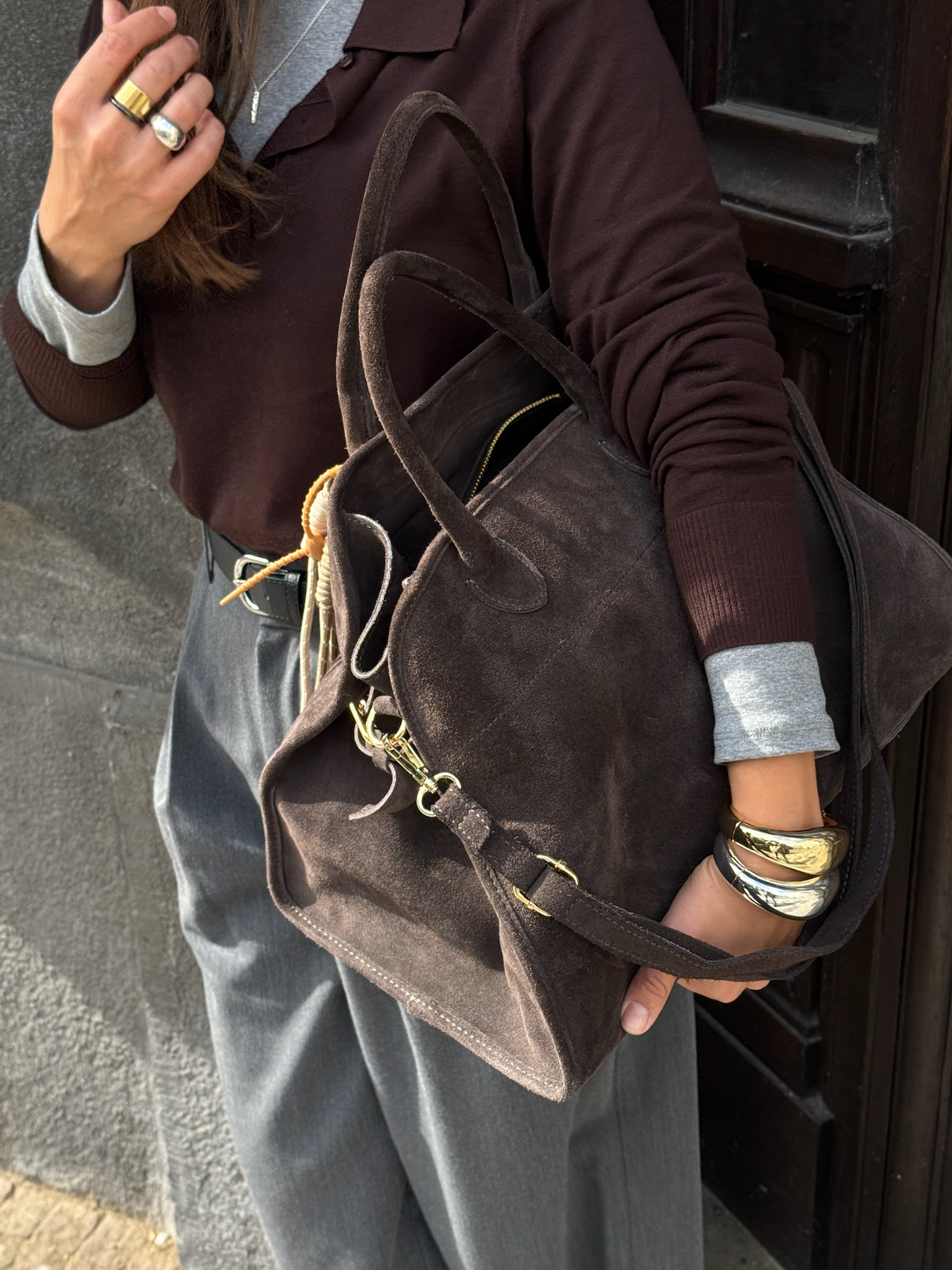 Tato elegantní kabelka je vyrobena v Itálii z kvalitní semišové kůže, která dodává jemný a luxusní vzhled. Spodní část je z klasické pevné kůže a opatřena ochrannými nožičkami...