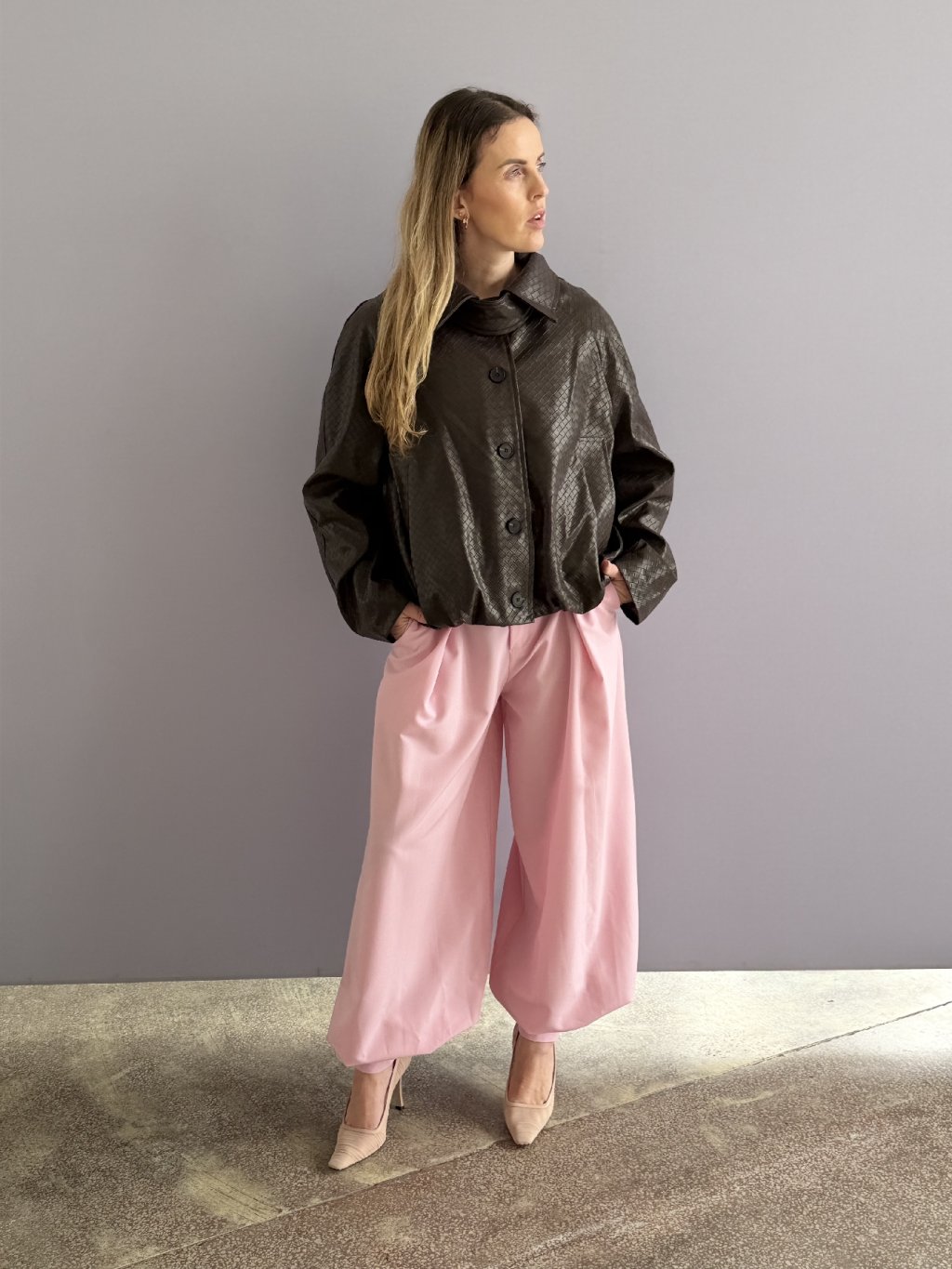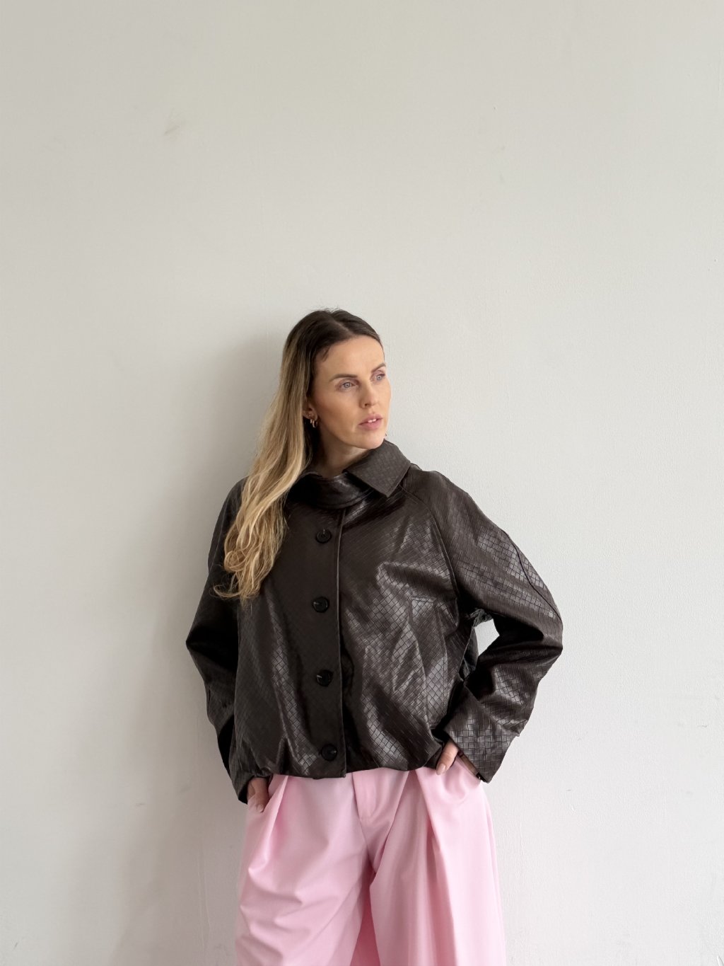 Strukturovaný materiál s plastickým vzorem dodává modelu hloubku a exkluzivní vzhled. Vyšší stojáček u krku krásně drží tvar a spolu s výraznější siluetou vytváří sebevědomý, moderní dojem. Zapínání na knoflíky podtrhuje minimalistický design a umožňuje nosit bundu zapnutou nebo rozepnutou jako lehkou vrstvu.