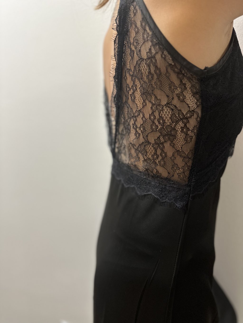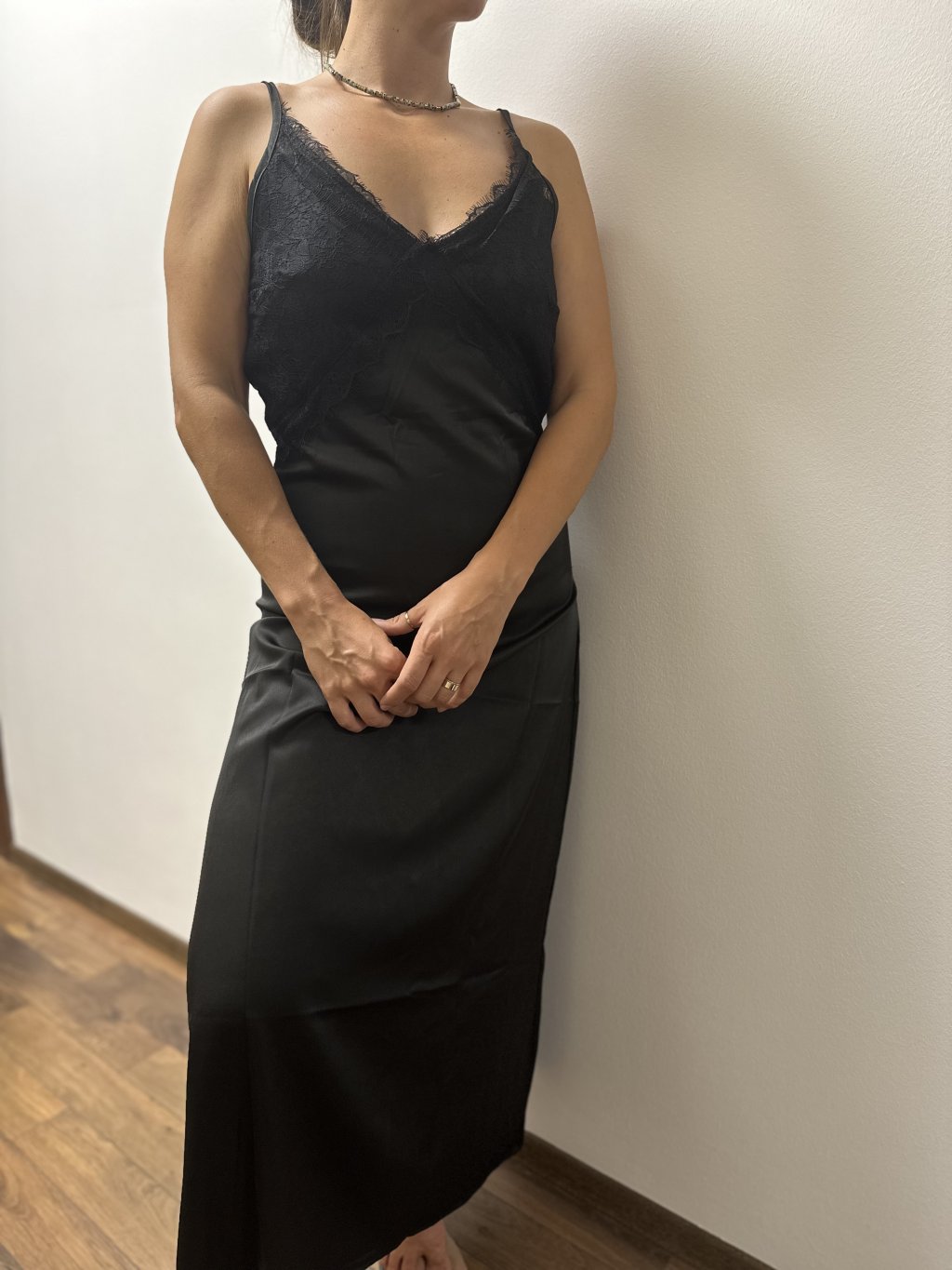 Tyto elegantní dámské dlouhé šaty v černé barvě jsou perfektní volbou pro večerní akce i formální události. Šaty jsou vyrobeny z jemného a lehkého materiálu, který zajišťuje pohodlí a volnost pohybu. Horní část šatů je zdobena krásnou krajkou, která dodává modelu sofistikovaný a ženský vzhled. Šaty mají hluboký výstřih do V, který je zdoben krajkou jak vpředu, tak i na zádech. Krajkový detail působí svůdně a elegantně zároveň.