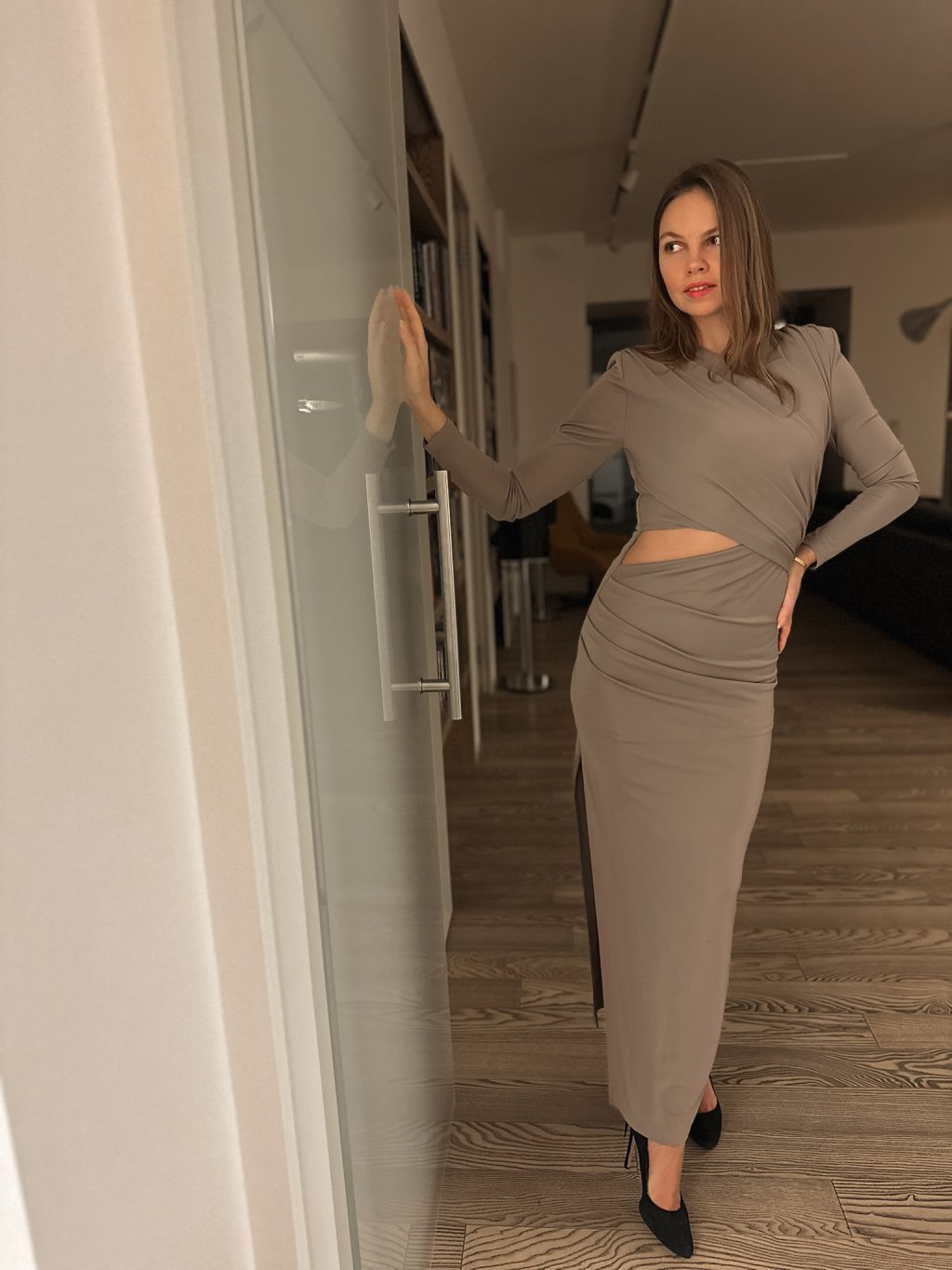 Tyto elegantní šaty v neutrální béžové barvě jsou ideální volbou pro slavnostní příležitosti i večerní události. Jsou vyrobeny z kvalitního, hladkého materiálu, který jemně přiléhá k tělu a vytváří krásnou siluetu. Šaty jsou navrženy s výraznou drapérií, která dodává outfitu sofistikovaný vzhled a přidává na zajímavosti. Dlouhé rukávy a uzavřený výstřih vyvažují odhalený bok, což šatům dodává tajemný a elegantní šarm.