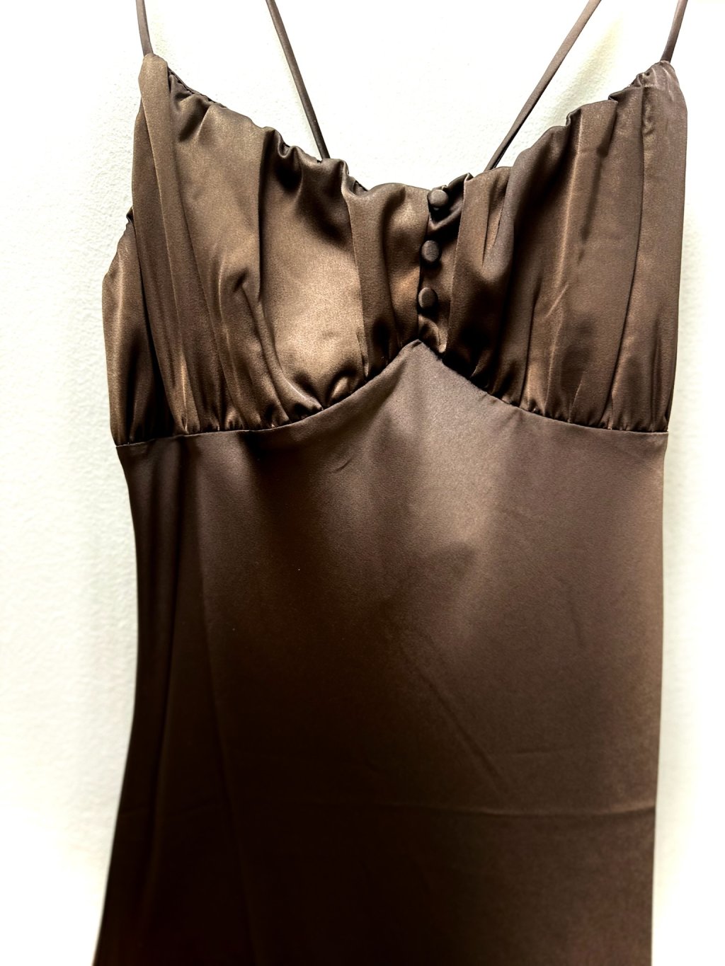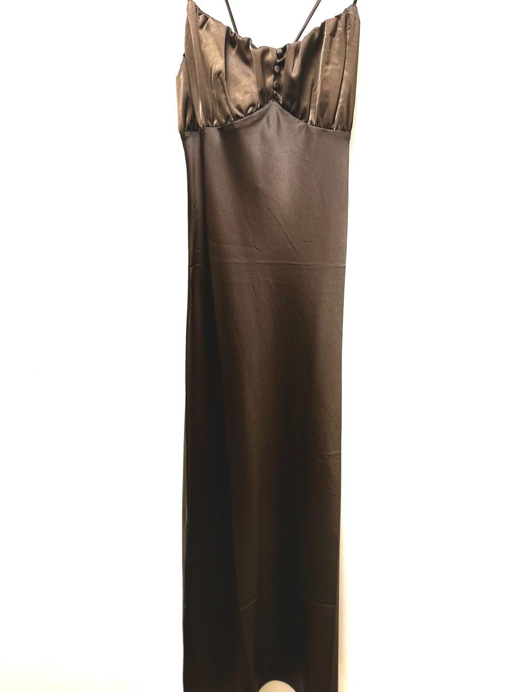 Tyto elegantní dámské dlouhé šaty v hnědé barvě jsou ideální volbou pro různé příležitosti, ať už jde o formální události nebo večerní setkání. Šaty jsou vyrobeny z jemného a lesklého materiálu, který zajišťuje pohodlné nošení a krásně splývá s postavou. Horní část šatů má jednoduchý, ale sofistikovaný design s lehkým řasením a zdobnými knoflíky na přední straně, které dodávají šatům stylový a elegantní vzhled. Tenká ramínka a dlouhý střih šatů přispívají k jejich vzdušnému a ženskému vzhledu.