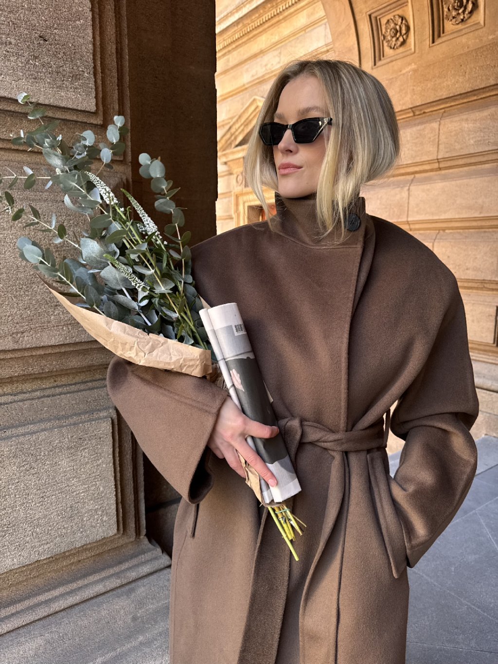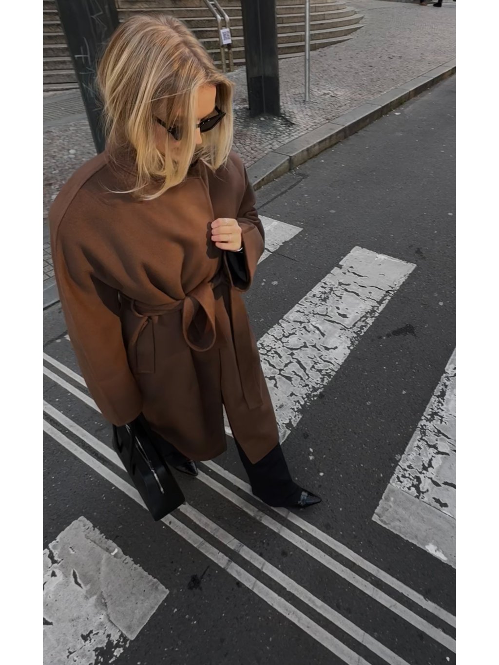 Tento dlouhý kabát s vysokým límcem na jeden knoflík spojuje minimalistický střih s luxusním materiálem. Krásně vypadá zapnutý i rozepnutý, má dvě praktické kapsy a součástí je pásek, kterým snadno vytvaruješ siluetu.