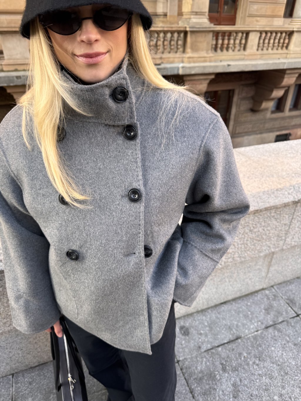 Barva: šedáDetaily: kontrastní černé knoflíky, vysoký límec, dvě kapsyMateriál: 100 % vlnaStřih: kratší, minimalistický, bez podšívky