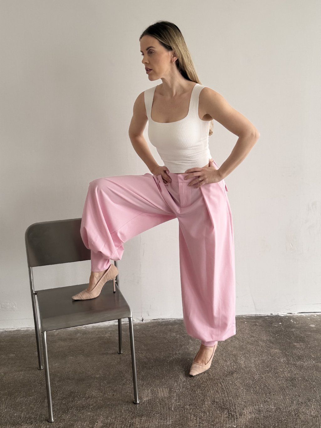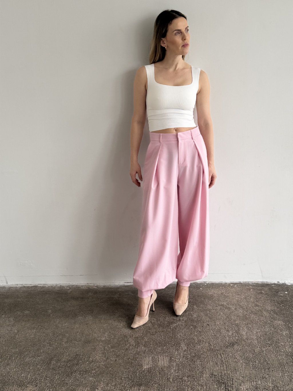 Růžové balónové kalhoty jsou kouskem, který okamžitě změní energii celého outfitu – a přitom zůstává překvapivě univerzální.